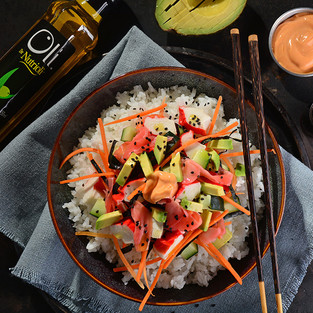 Para servir coloca en tazones individuales una parte de arroz y una porción de aguacate, zanahoria, pepino, cangrejo y sazona con la mayonesa y una cucharadita de aceite de oliva sobre cada tazón. Decora con jengibre y ajonjolí negro.